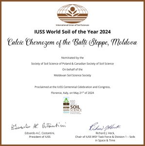The “Chernozem of the Balti Steppe, Moldova” was officially proclaimed as the inaugural “IUSS World Soil of the Year” during the closing ceremony of the 2024 Centennial Congress and Celebration in Florence. Official nomination of this soil was provided by the Soil Science Society of Poland and the Canadian Society of Soil Science, on behalf of the Moldovan Society of Soil Science. Dr. Boris Boincean received the award from IUSS President Edoardo Costantini, on behalf of the Moldovan Society of Soil Science, and then provided an overview of the Chernozems of the Balti Steppe. This was complemented with a presentation, by Dr. Cezary Kabala (Chair of the IUSS WRB Working Group), on the global significance of chernozemic soils. Further information regarding the 2024 IUSS WSY can be obtained by contacting Dr. Boincean (bboincean@gmail.com).